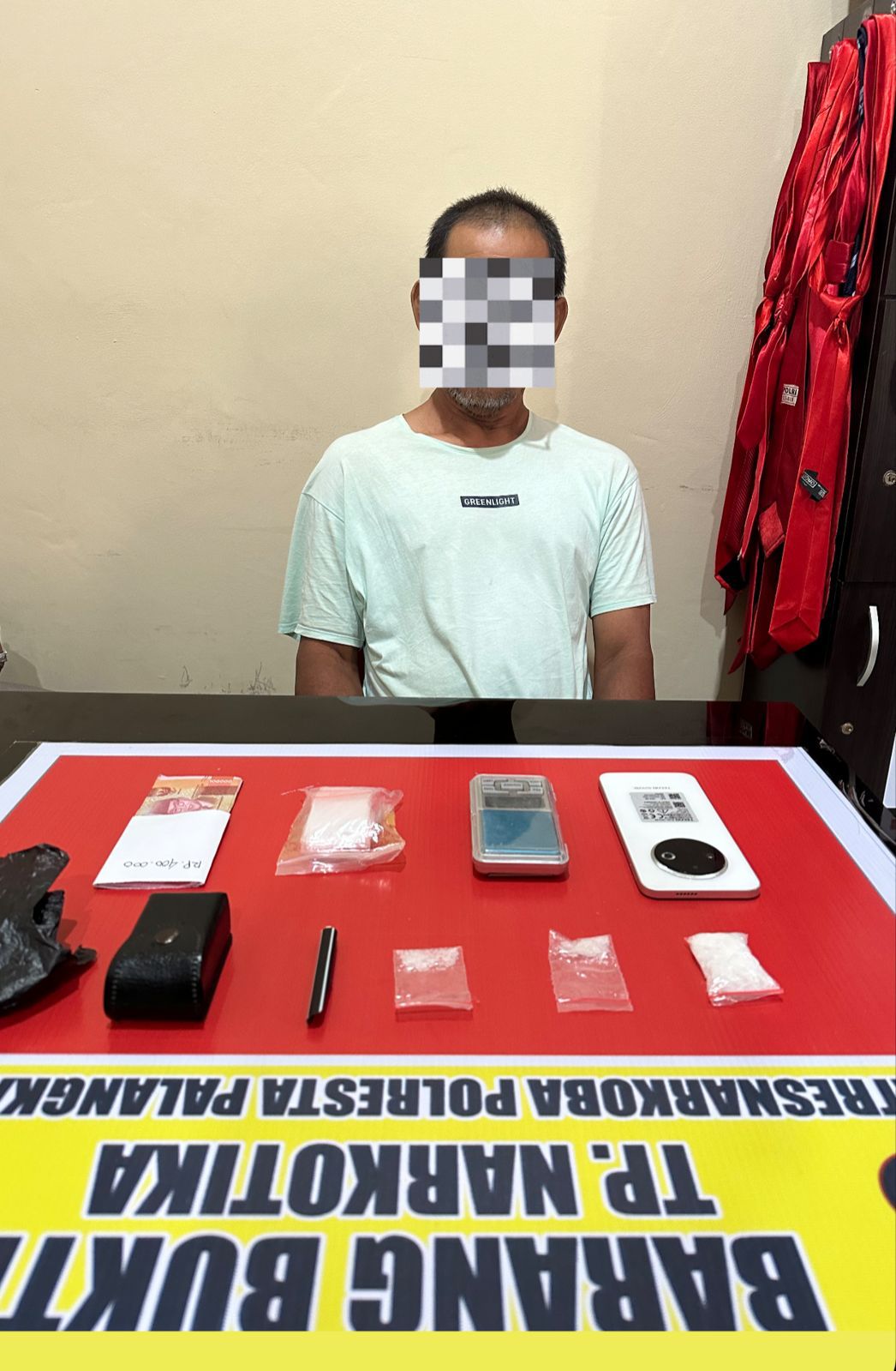 Saat penggeledahan, polisi menemukan tiga paket sabu dengan berat total 11,35 gram, timbangan digital, sendok sabu, plastik klip, serta kotak kecil berwarna hitam. Selain itu, diamankan pula sebuah handphone merk Tecno Spark warna putih dan uang tunai Rp 400.000,- yang diduga hasil transaksi narkoba.